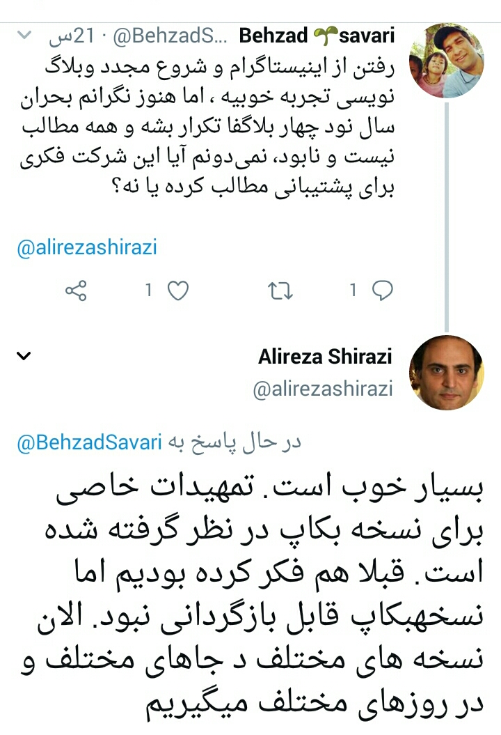 دیشب تویتی زدم در رابطه با آغاز مجدد وبلاگ نویسی در بلاگفا و ابراز نگرانی کردم در ارتباط با تکرار بحران سال نود چهار این شرکت که موجب پاک شدن تاریخچه وبلاگ ها شده بود ، آقای شیرازی مدیر محترم بلاگفا را هم منشن کردم که ایشان در پاسخ تویتم نوشتند شرکت برای این مشکل تهمیداتی در نظر گرفته و از مطالب و تاریخچه ویلاگاه در روزهای متفاوت و در محل های متفاوت پشتیبانی گرفته میشود. بنا بر این با خیال راحت میتوانیم وبلاگ بنویسیم و نگرانی در تکرار از دست رفتن مطالب وبلاگ وجود نپاذن